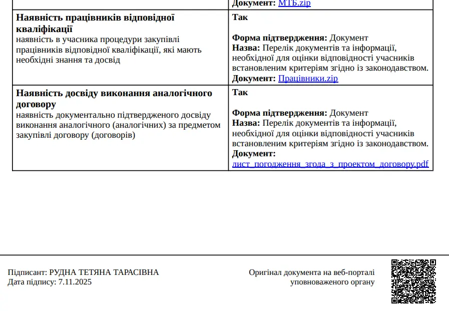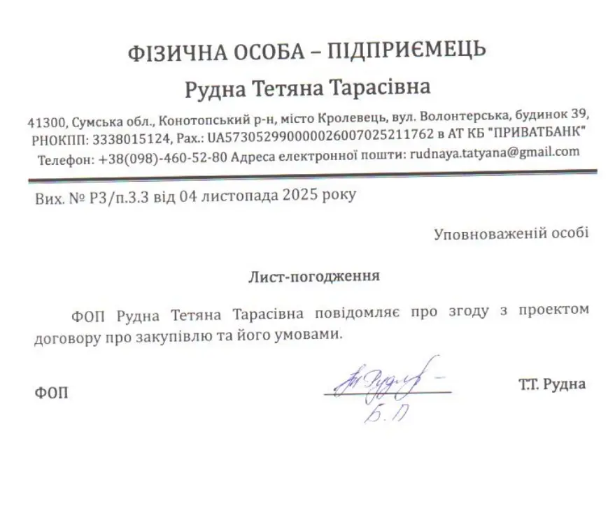Згідно з тендерною документацією, замовник вимагав від учасників підтвердити наявність досвіду виконання аналогічних робіт. Це стандартна норма, покликана відсіяти фірми-одноденки та шахраїв. Проте тендерний комітет комунального підприємства не збентежив той факт, що ФОП Рудна була зареєстрована прямо перед оголошенням закупівлі, а замість копії аналогічного договору завантажний… лист погодження про згоду з проектом договору. Це не просто порушення, а абсолютна підміна понять та документів.