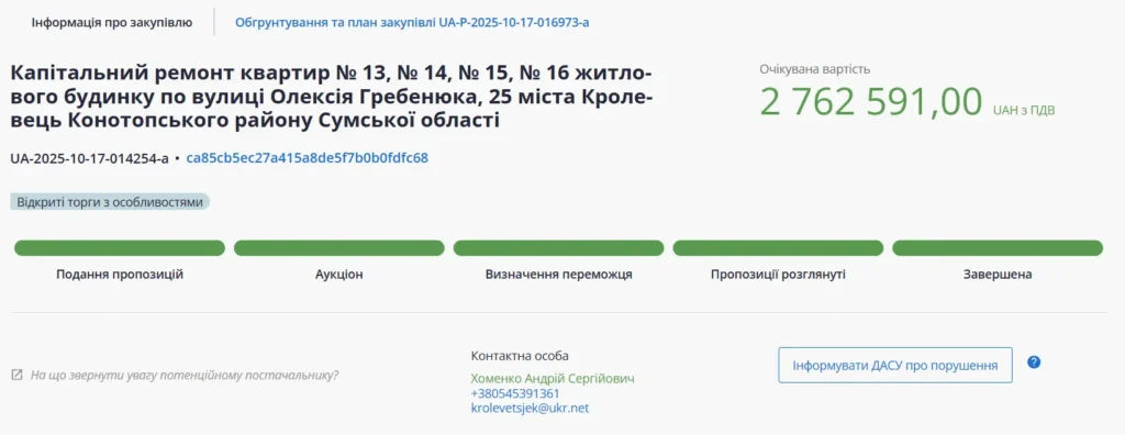 Саме тут КП «Кролевецька ЖЕК» без вагань віддало підряд на капітальний ремонт квартир вартістю майже 2,8 мільйона гривень підприємниці, чий бізнес-досвід на момент оголошення про проведення закупівлі обчислювався годинами.