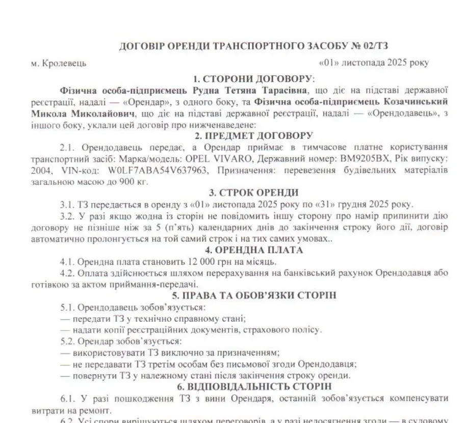 Остаточні сумніви розвіює договір оренди транспортного засобу № 02/ТЗ від 1 листопада 2025 року. Згідно з ним, ФОП Рудна орендує вантажний фургон OPEL VIVARO (державний номер ВМ9205ВХ) не у сторонньої компанії, а безпосередньо у того ж таки ФОП Козачинського Миколи Миколайовича. Це замикає коло: техніка — Козачинського, люди — Козачинського, а підпис на багатомільйонному контракті ставить Рудна, зареєстрована за день до тендеру.