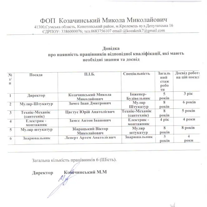 Детальне вивчення довідок про працівників розкриває цікаву картину: штат новоствореної фірми повністю дублює команду іншого місцевого підприємця — Козачинського Миколи Миколайовича.