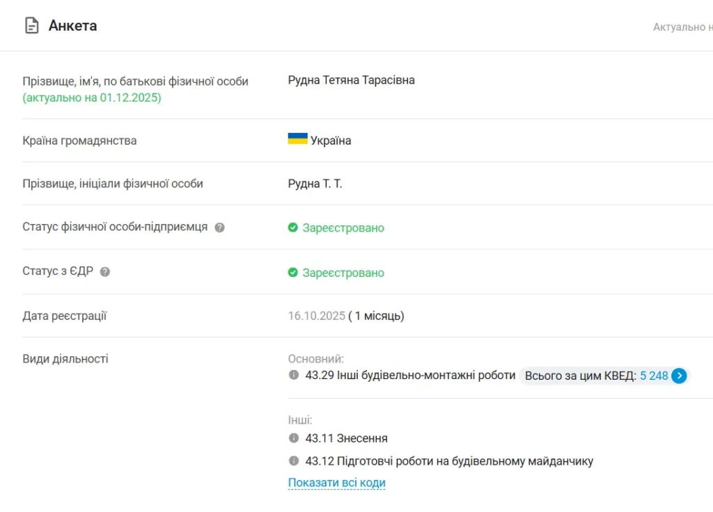 Історія розпочалася в середині жовтня 2025 року. За інформацією аналітичної платформи Youcontrol, 16 жовтня у державних реєстрах з’являється новий запис: фізична особа-підприємець Рудна Тетяна Тарасівна. А вже 17 жовтня, буквально наступного дня, місцевий ЖЕК оголошує закупівлю послуг з капітального ремонту квартир у житловому будинку по вулиці Олексія Гребенюка, 25. Збіг? Можливо. Але подальші події перетворюють цей збіг на хрестоматійний приклад тендерної змови.